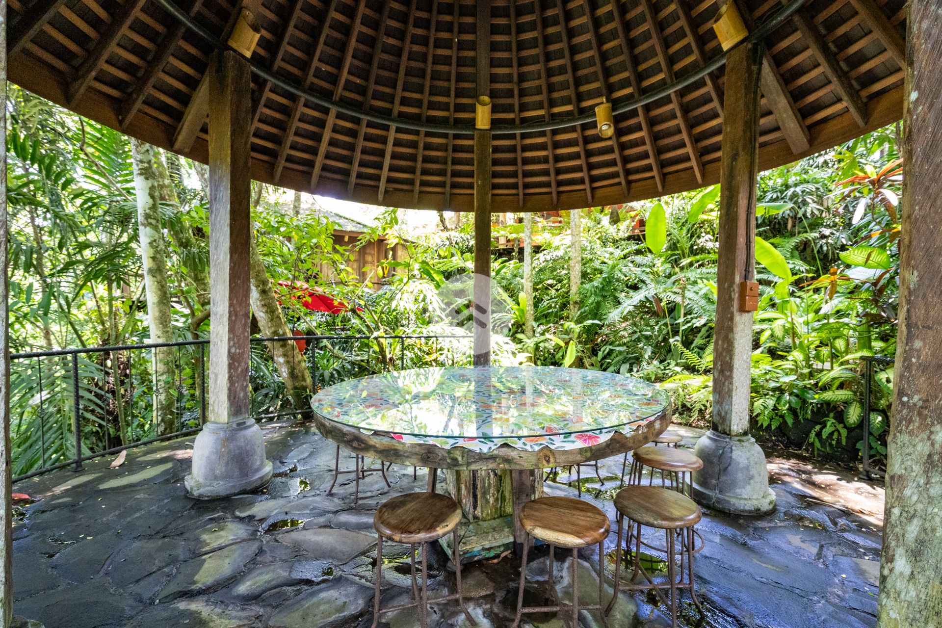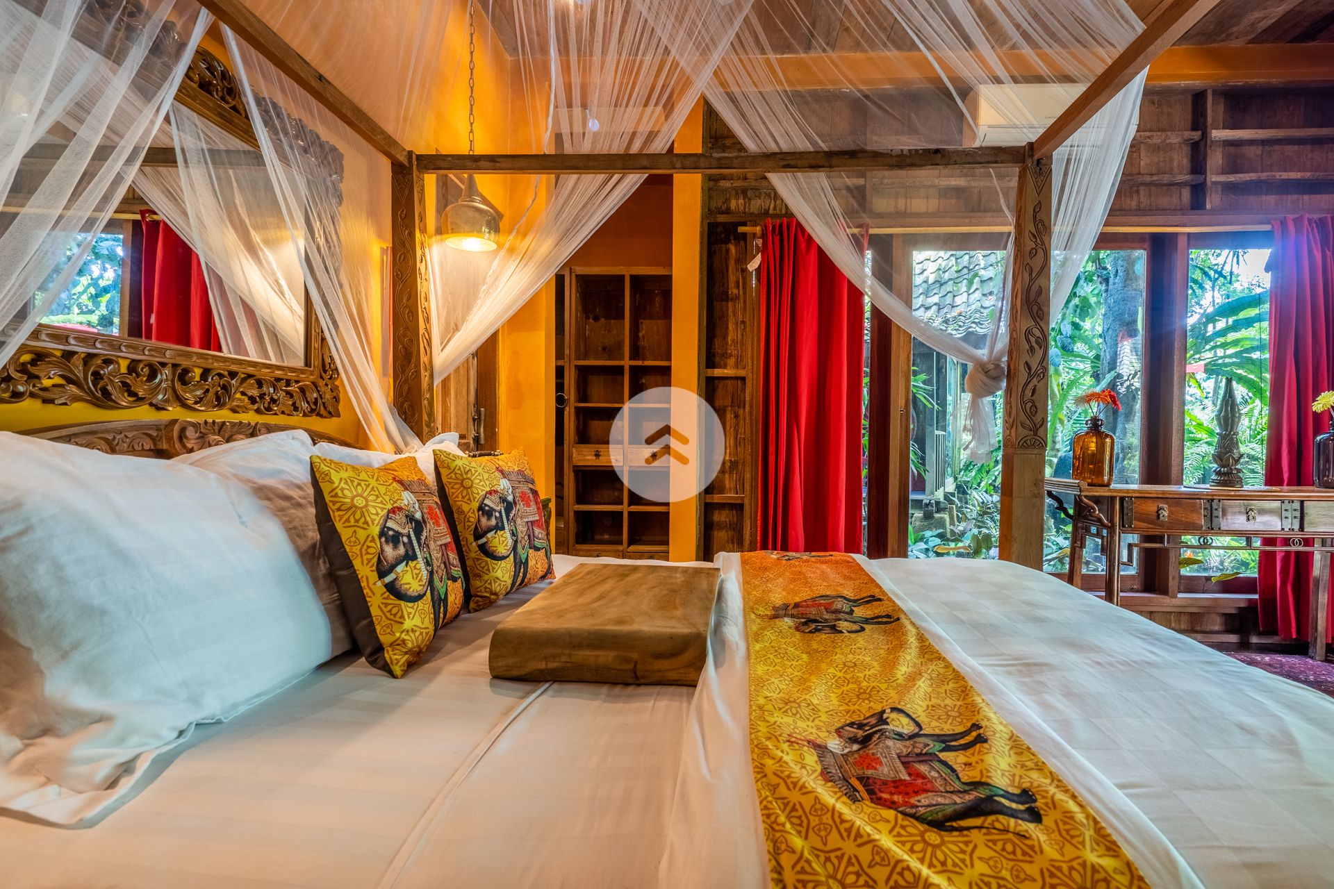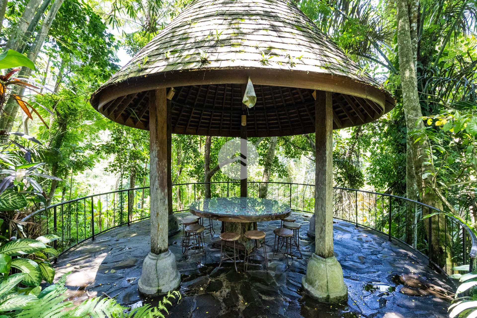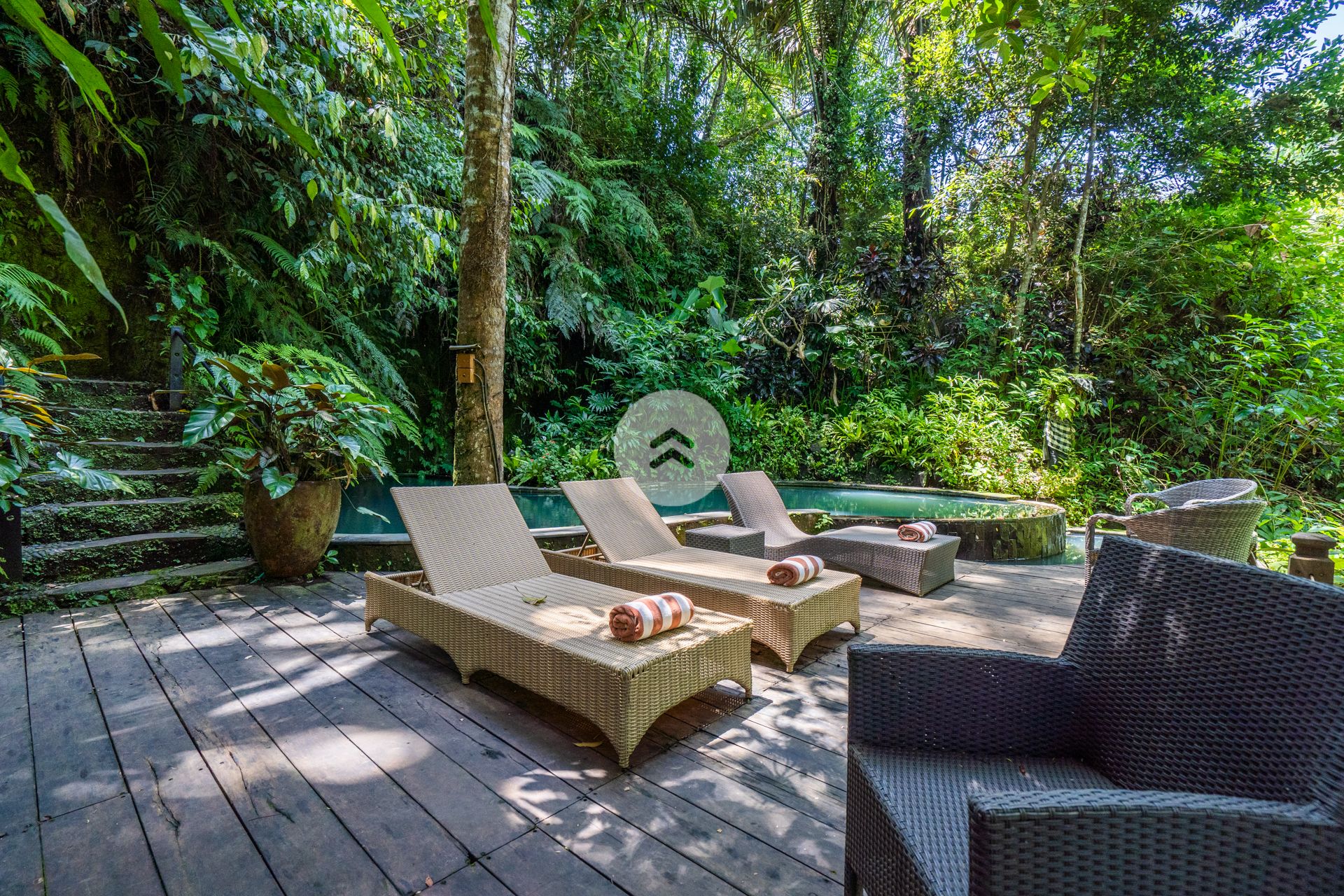A stunning antique style home perched above Bali's Petanu River and just minutes from central Ubud. In Robinson Caruso fashion, the structure floats atop a jungle setting, affording views of a rare variety of native flora, fauna and rare indigenous trees. A nature sanctuary, the villa gains its inspiration from the traditional Javanese joglo architecture, incorporating natural tree trunk pillars and luxurious solid wood floors. The Master Bedroom stands apart from the two-storey open-air main house, as does the companion rustic French style kitchen. Moving down the embankment and toward the river, the property boasts a magnificent free-form pool complete with waterfalls, reflection pools, and an absolutely unique cliff-side dwelling in the form of a rustic cottage - the perfect get-away. Best of all, our home features a team of people who will tantalize your taste buds with epicurean delights from around the world. Our "house best" is our Indonesian meal!