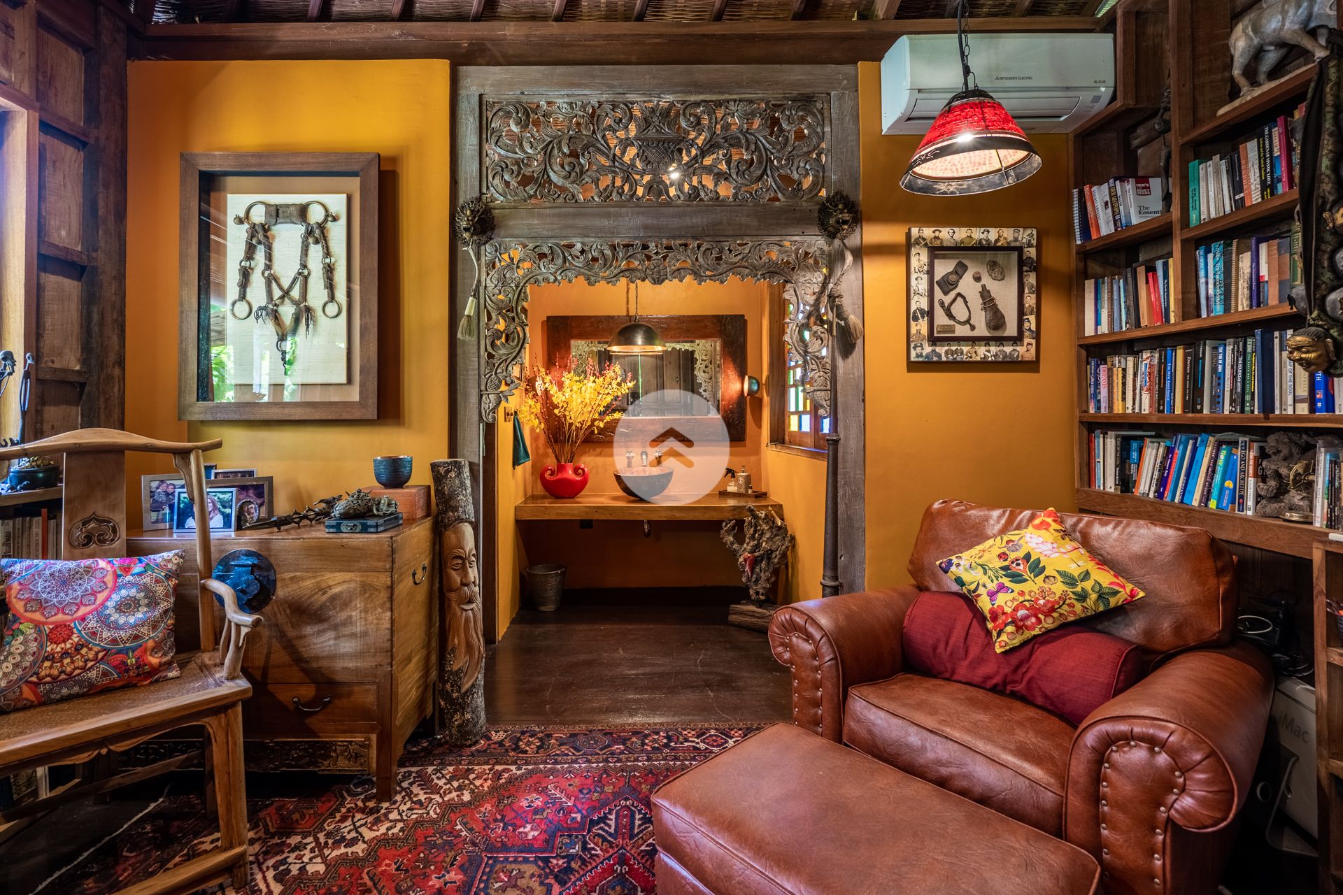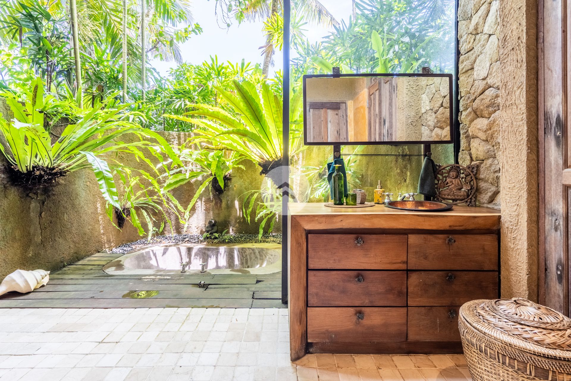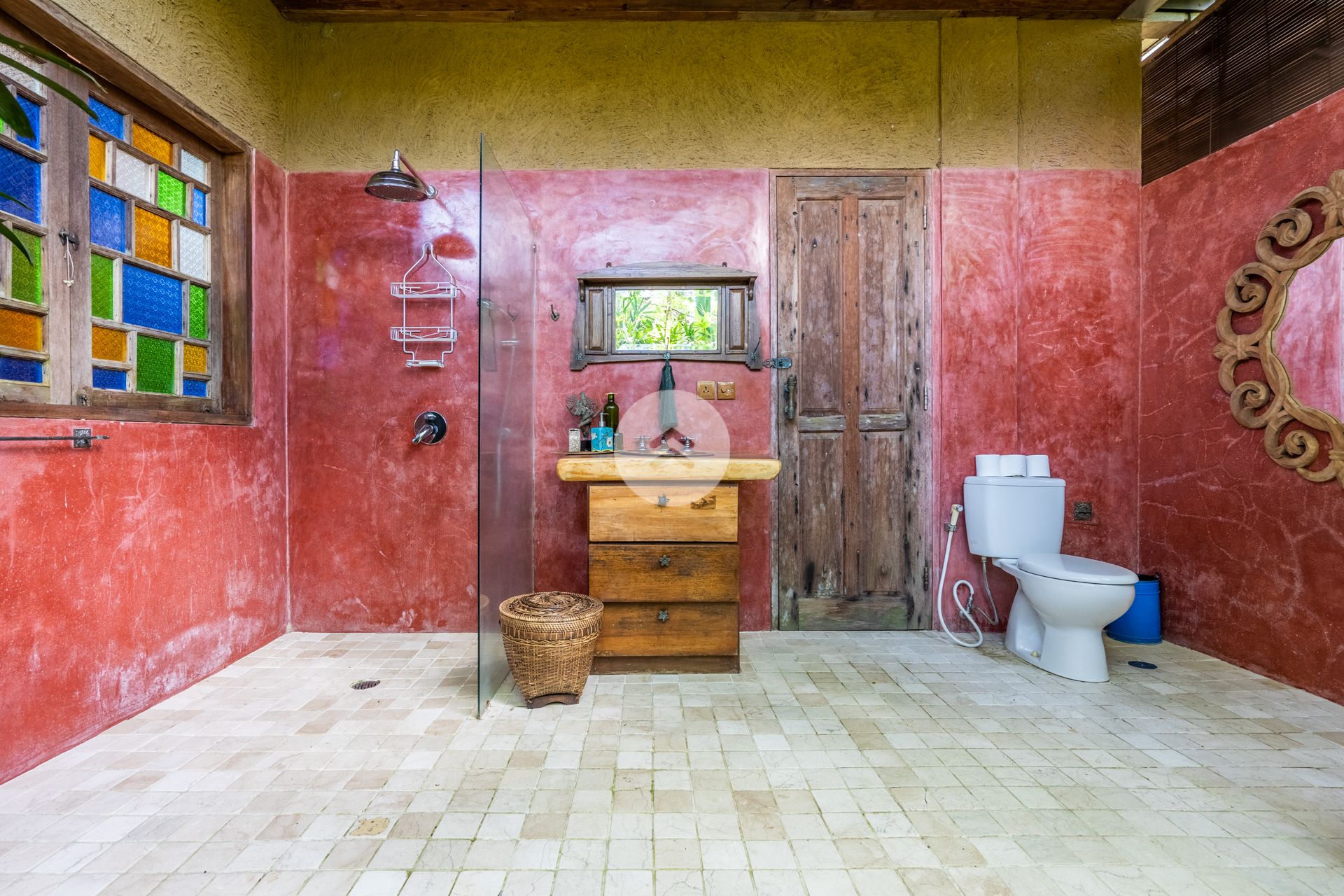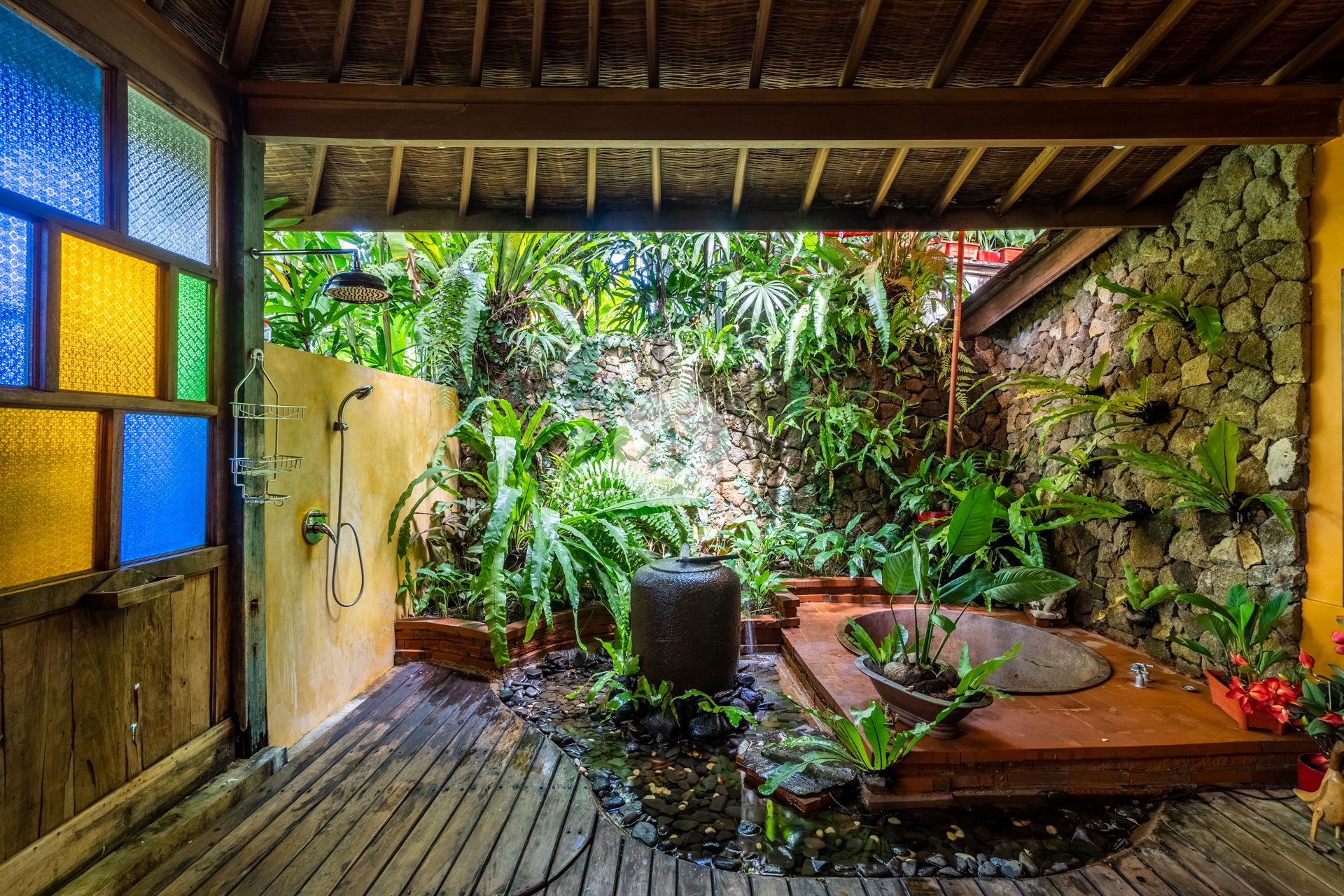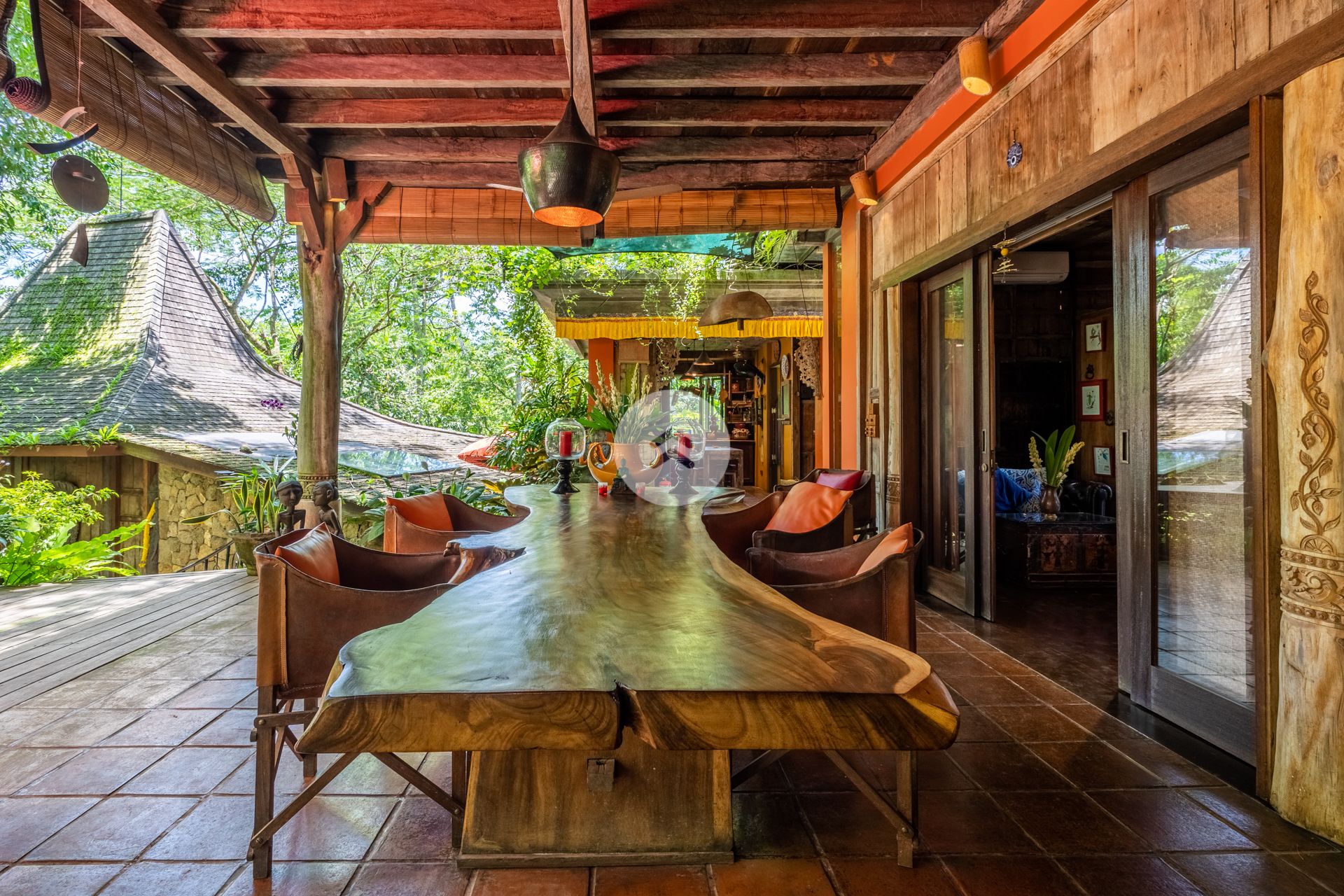 A stunning antique style home perched above Bali's Petanu River and just minutes from central Ubud. In Robinson Caruso fashion, the structure floats atop a jungle setting, affording views of a rare variety of native flora, fauna and rare indigenous trees. A nature sanctuary, the villa gains its inspiration from the traditional Javanese joglo architecture, incorporating natural tree trunk pillars and luxurious solid wood floors. The Master Bedroom stands apart from the two-storey open-air main house, as does the companion rustic French style kitchen. Moving down the embankment and toward the river, the property boasts a magnificent free-form pool complete with waterfalls, reflection pools, and an absolutely unique cliff-side dwelling in the form of a rustic cottage - the perfect get-away. Best of all, our home features a team of people who will tantalize your taste buds with epicurean delights from around the world. Our "house best" is our Indonesian meal!